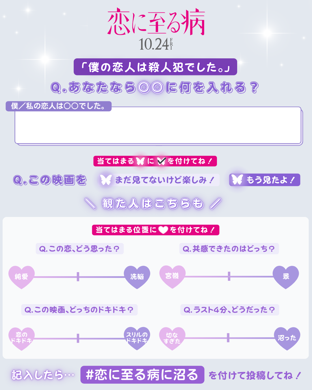 ②ハッシュタグ< #恋に至る病に沼る >をつけて、映画への期待・感想コメントを投稿