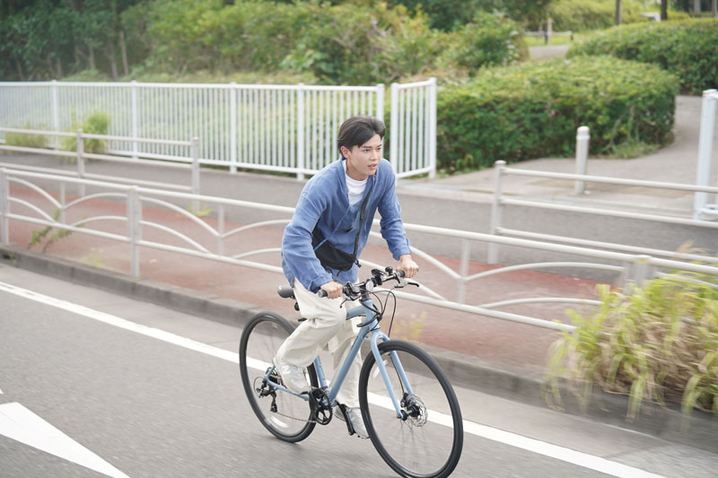 景が乗ったモノレールと自転車で並走する宮嶺のシーンも印象深いが、実際かなりの走行距離を長尾自らが走っている。